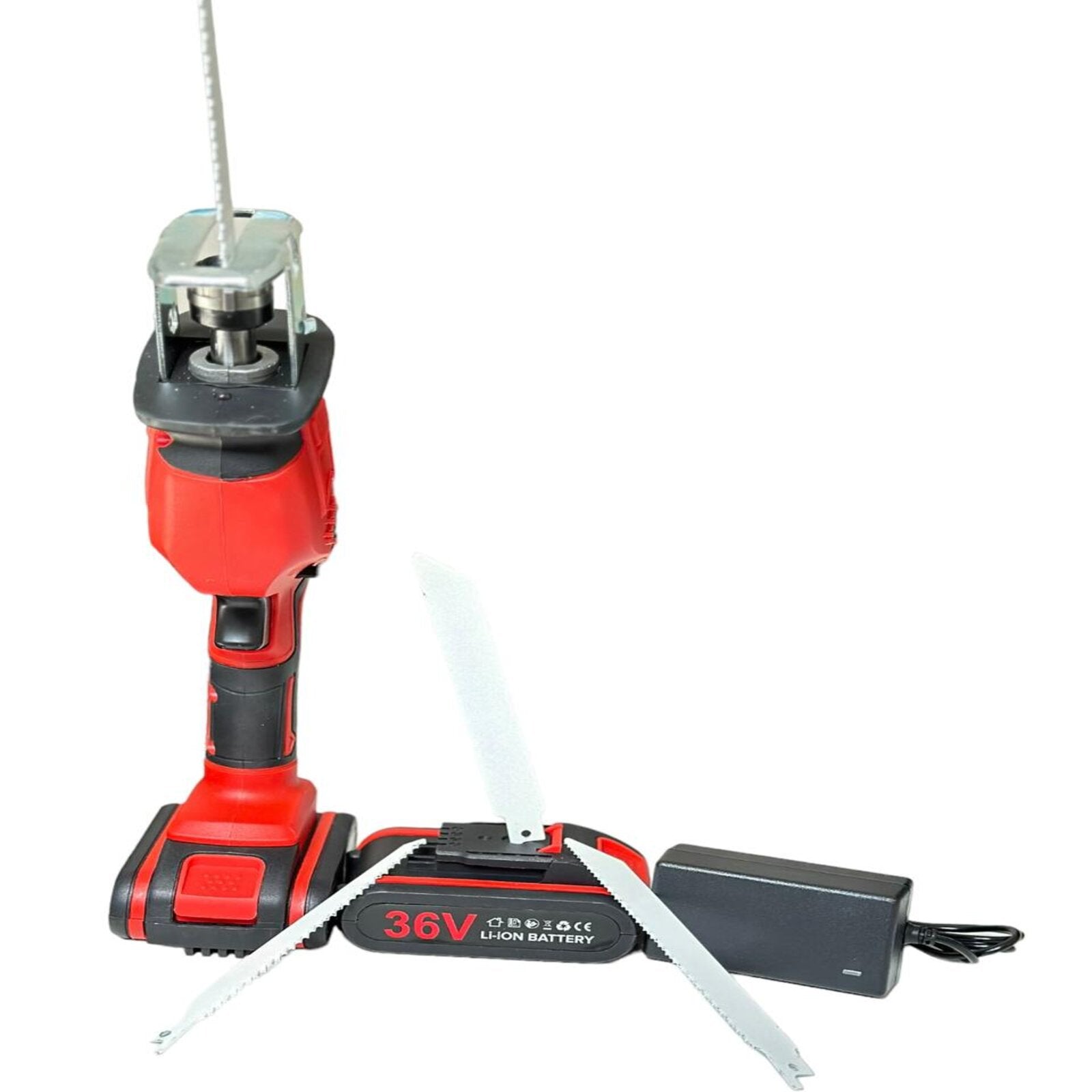 Akumulátorová priamočiara píla s 2 batériami 36 V a rýchlonabíjačkou, ktorá vás nenechá chvíľu čakať.