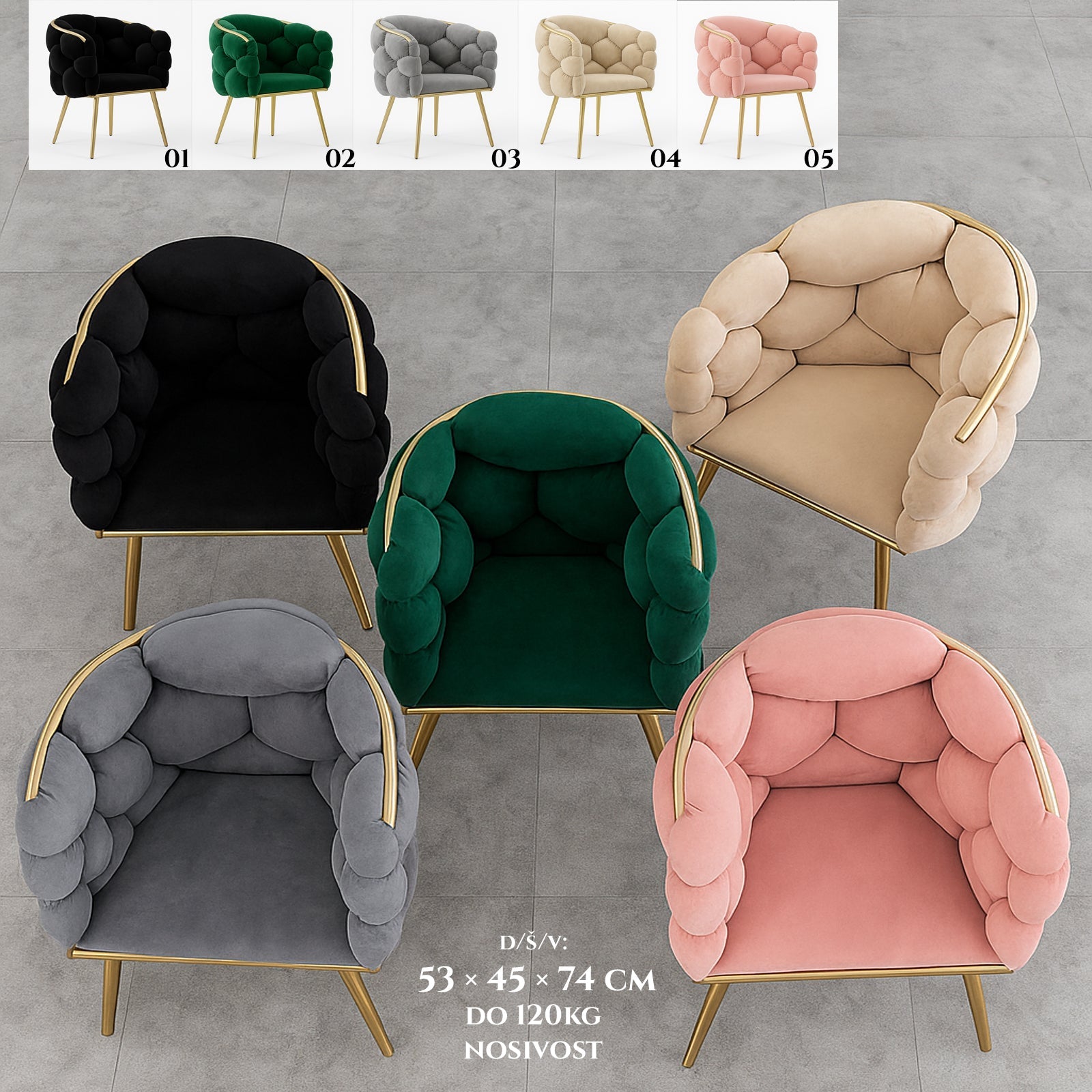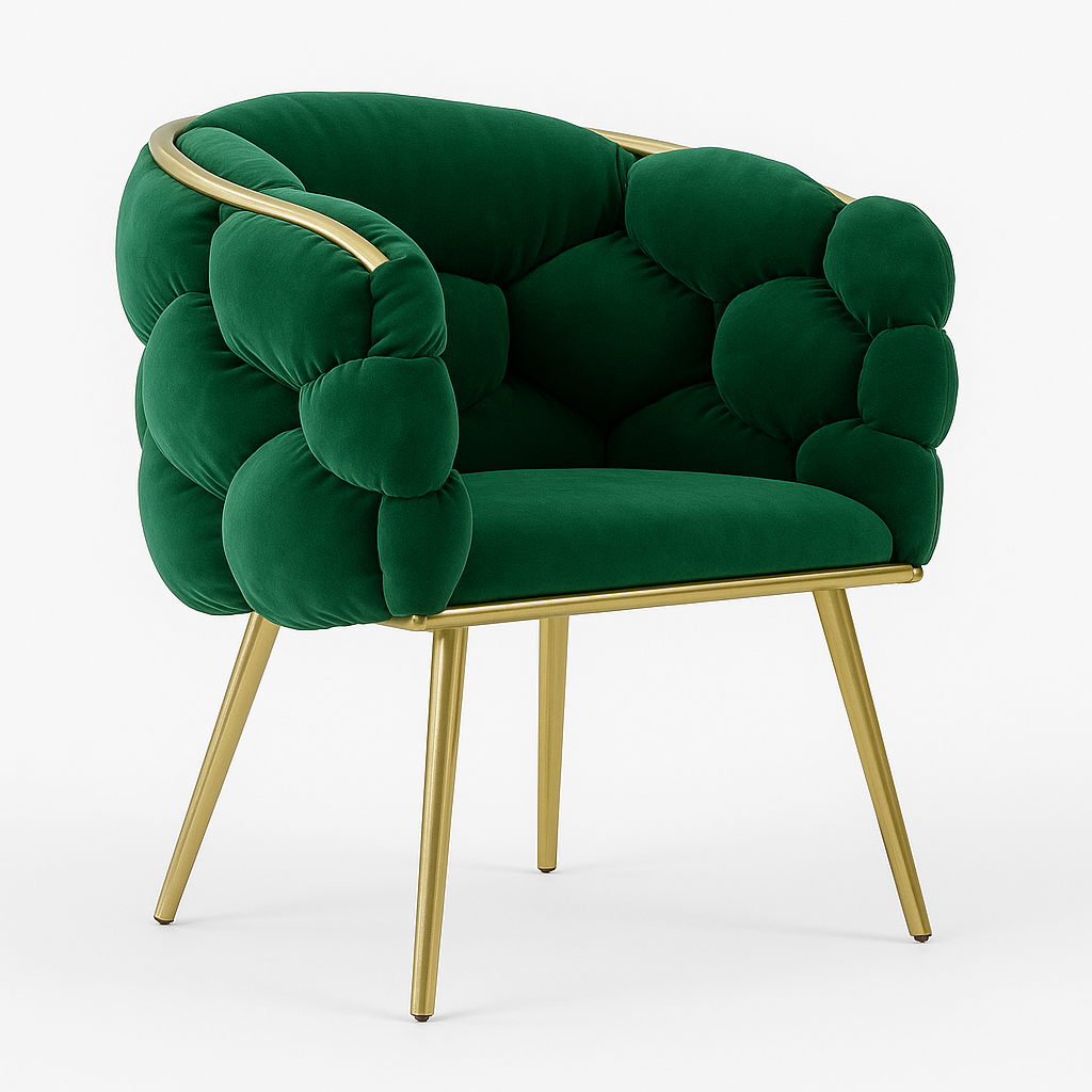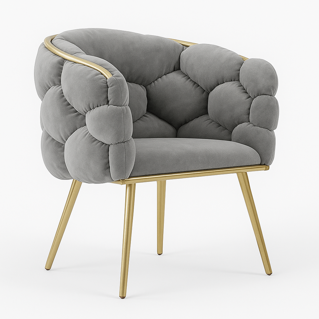 Ova elegantna bubble stolica donosi savršenu kombinaciju mekog baršuna, udobnog pufastog dizajna i zlatnog metalnog postolja koje prostoru daje dozu luksuza.