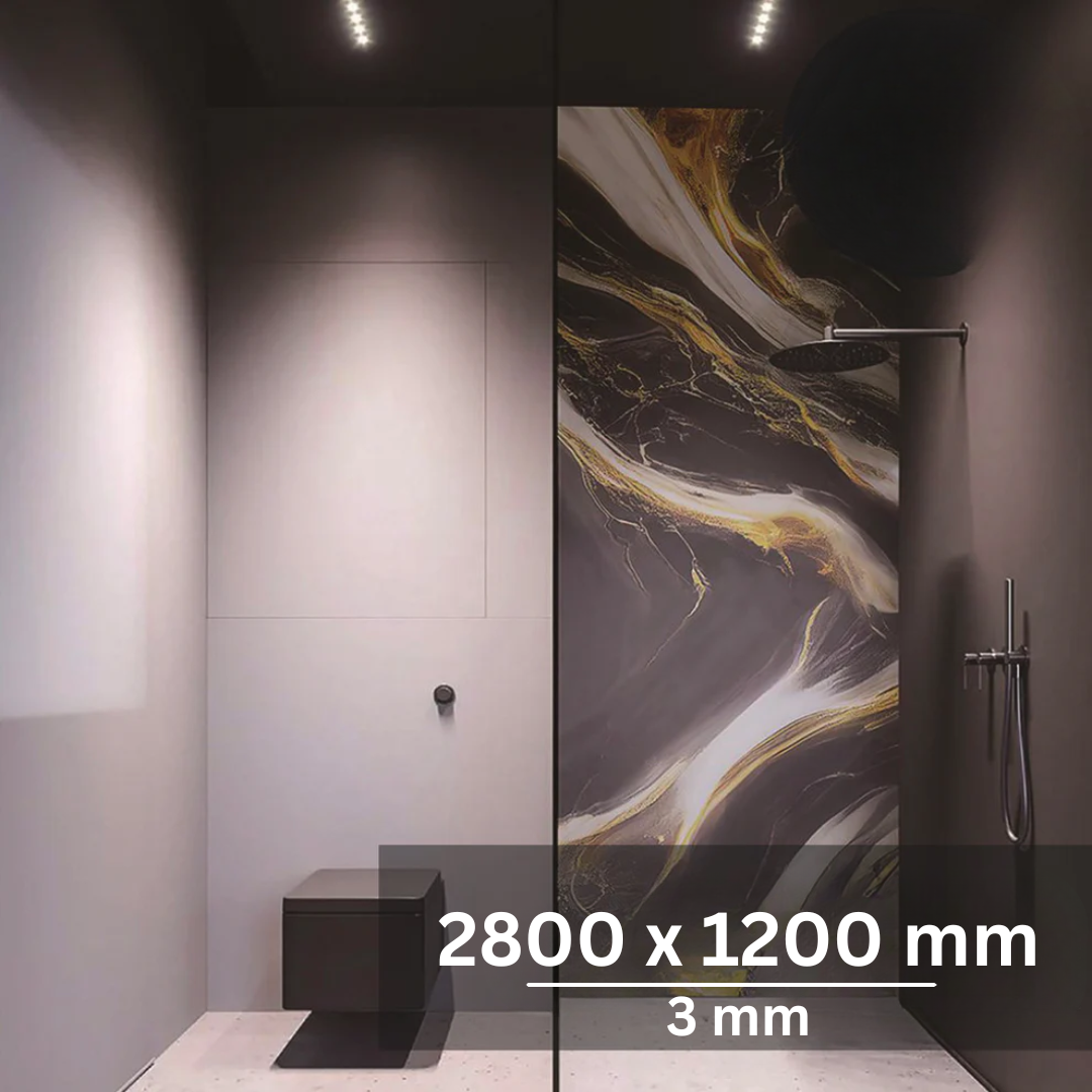 Predefinirajte luksuz u svojoj kupaonici. Panel Future donosi kozmičku estetiku tamnog kamena prožetog zlatnim mlazovima, stvarajući ambijent koji ostavlja bez daha.