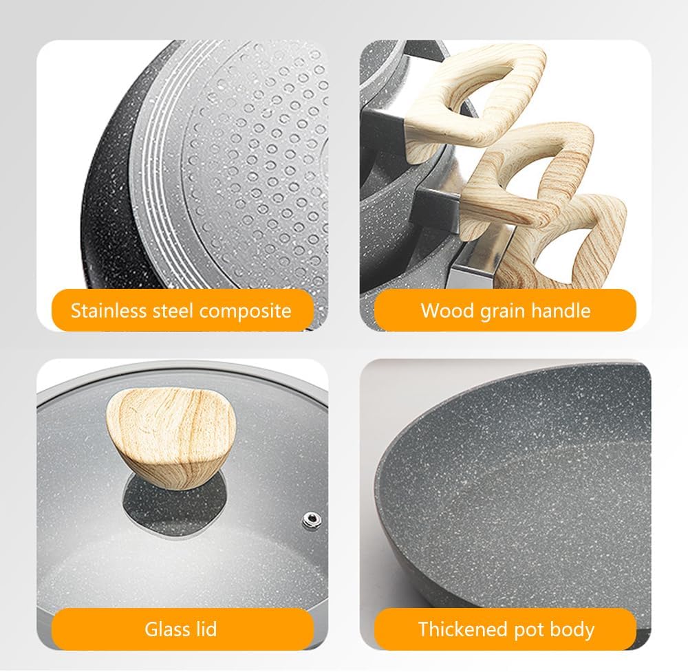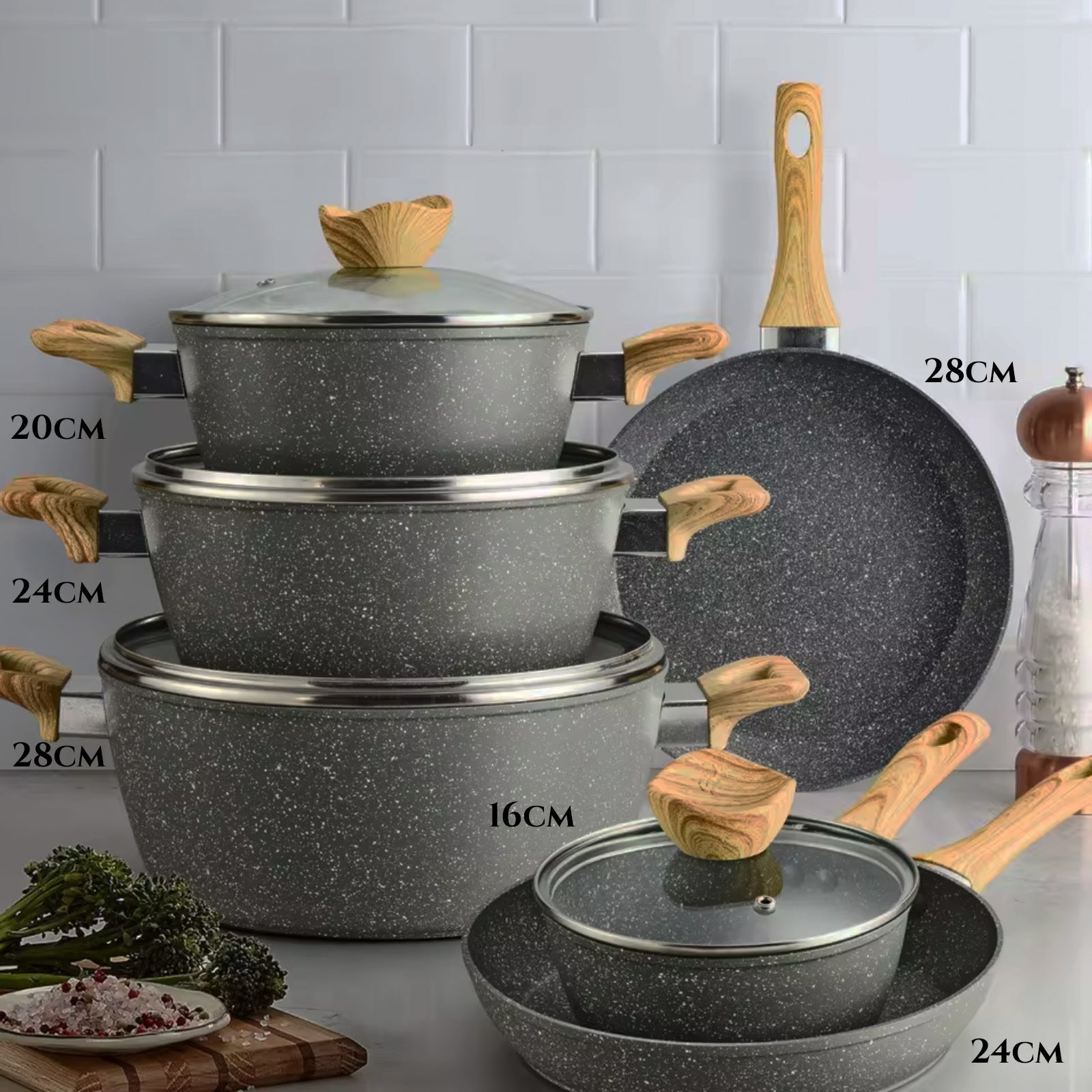 Unesite eleganciju i funkcionalnost u svoju kuhinju uz vrhunski set kamenog posuđa s efektom granita i detaljima od drveta. Idealno za svakodnevno kuhanje, zdravo pripremanje hrane i dugotrajnu upotrebu.