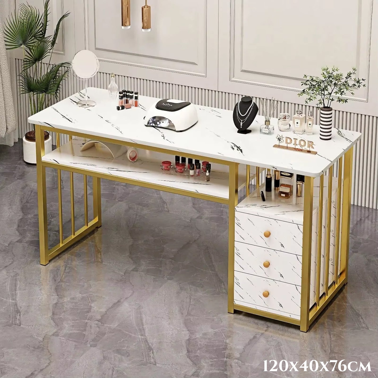 Radna ploha dužine 120 cm i širine 40 cm pruža dovoljno prostora za šminkanje, uređivanje noktiju, organizaciju kozmetike ili rad na klijenticama u salonu. Visina stola od 76 cm prilagođena je udobnom sjedenju s većinom standardnih stolica.
