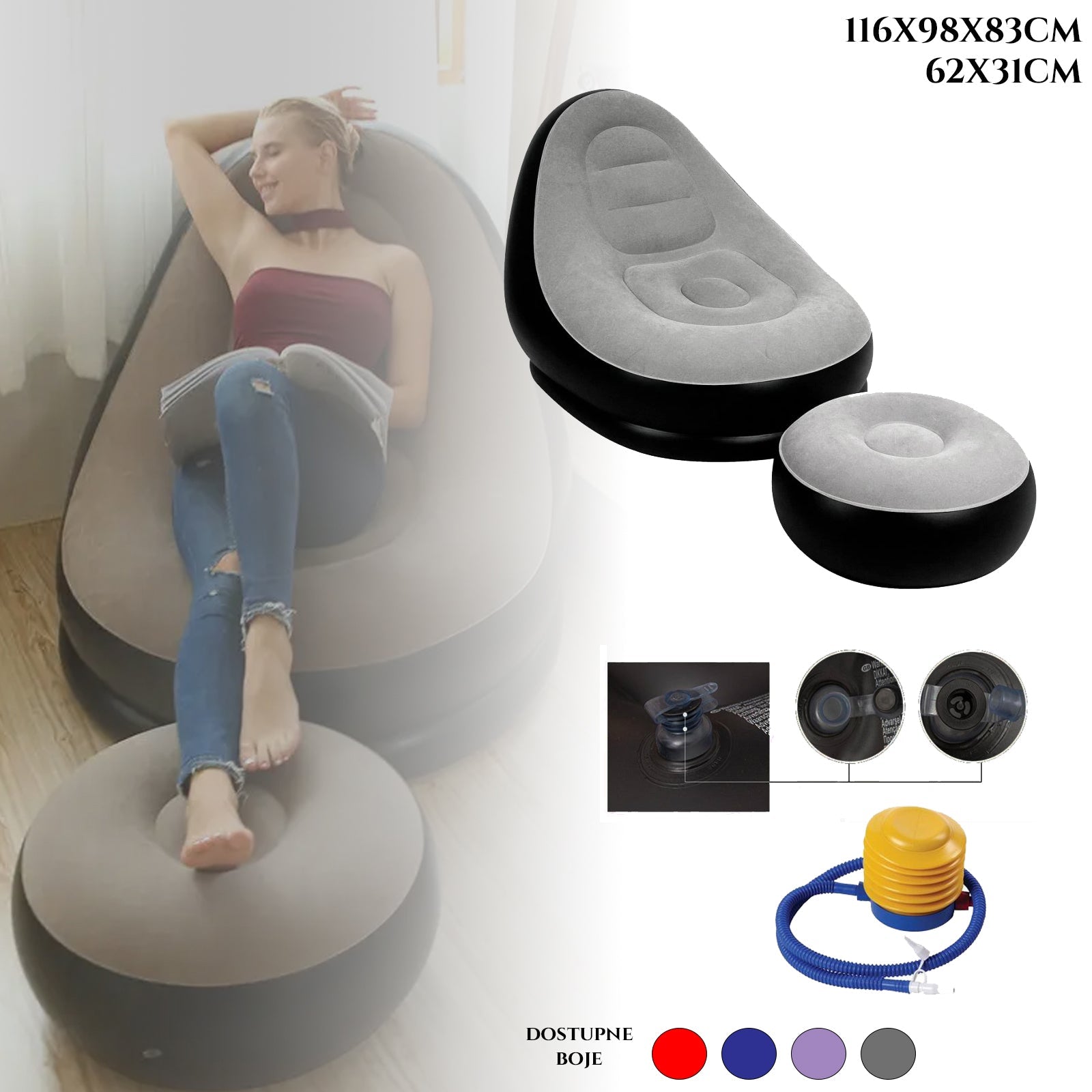 - Praktičnost: Uz priloženu pumpu, stolica i jastuk se napuhuju u trenu i lako spremaju nakon korištenja.