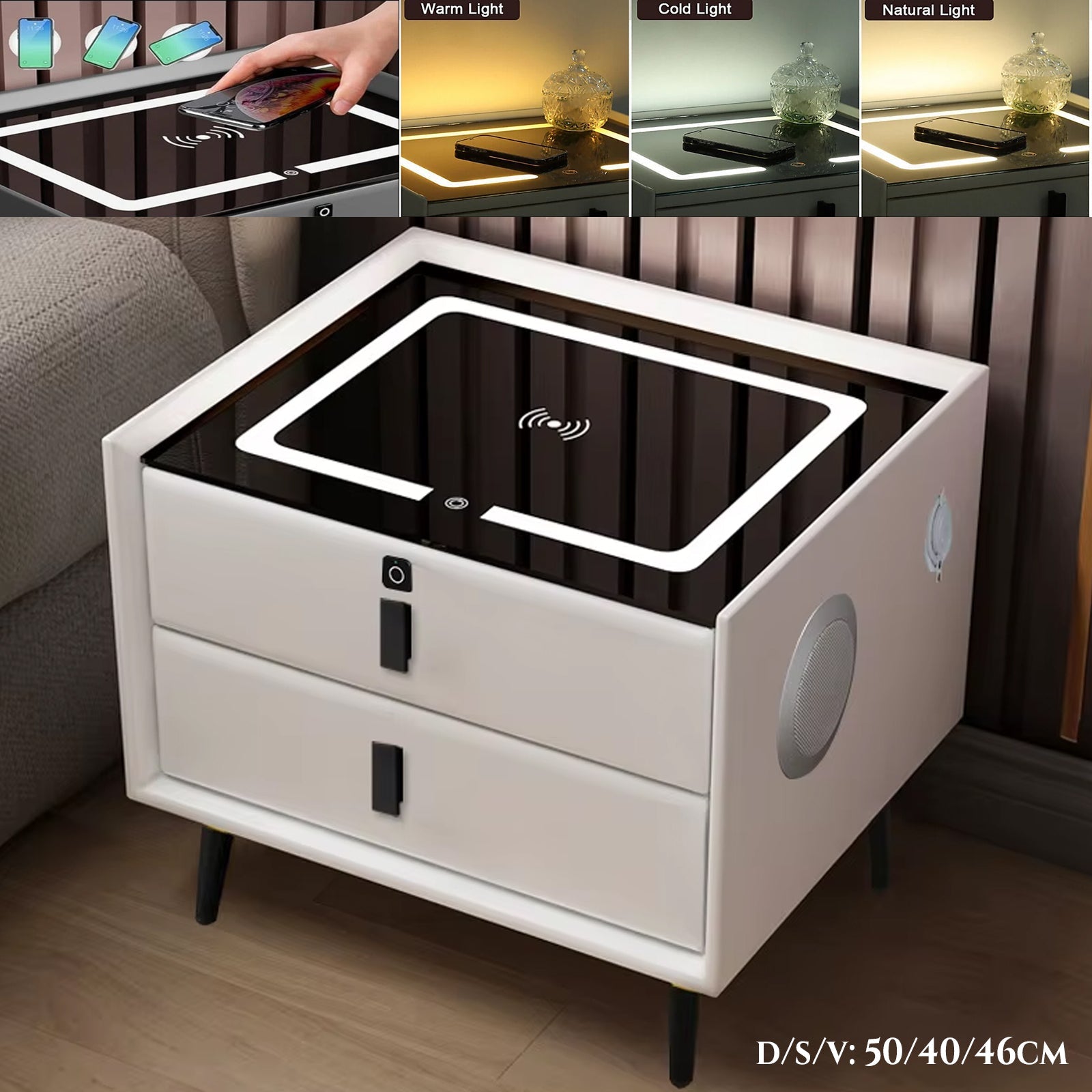 Postavite ovaj ormarić uz krevet kako biste imali punjenje telefona, rasvjetu i glazbu na dohvat ruke. Savršena kombinacija funkcionalnosti i modernog dizajna za vašu spavaću sobu.