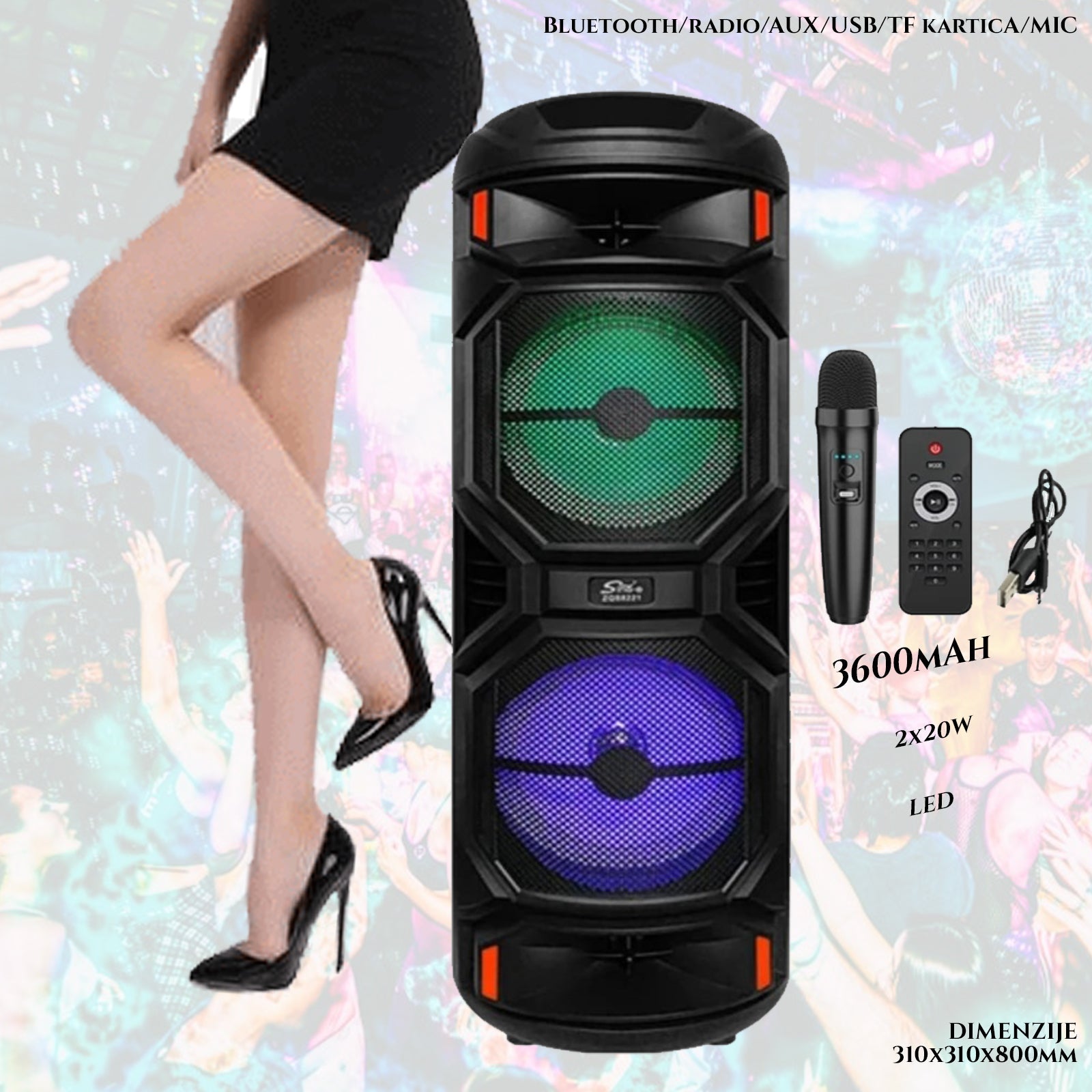 Podporuje Bluetooth/rádio/AUX/USB/TF kartu/MIC ROZMERY 310x310x800mm Kapacita batérie 3600mAh1. Úplne nový a vysoko kvalitný.